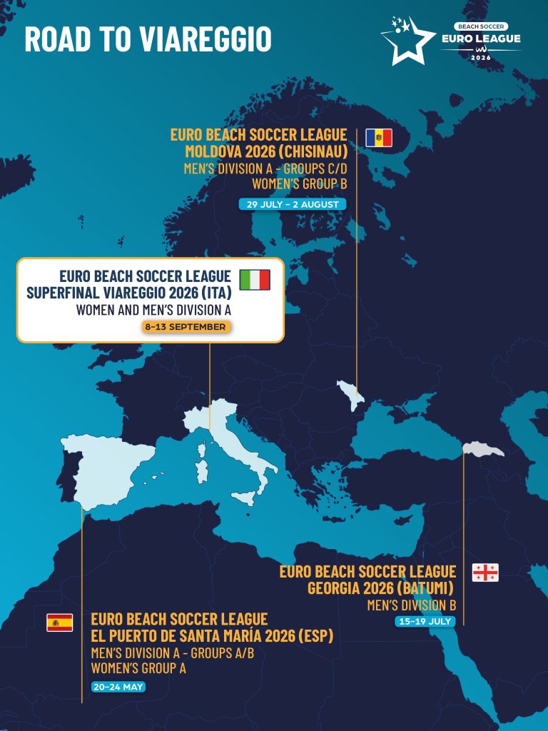 All European Beach Soccer roads lead to Viareggio! Every nation will wish to be on Italian sands in September to stake their claim to be crowned Euro Beach Soccer League 2026 champions.